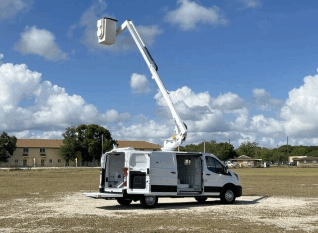 2024 Ford Transit 350 with low roof, 42, 9,500 lbs GVWR, 148 wheelbase, 3.5L V6 Flex Fuel engine, 10-Sp automatic transmission, hydraulic suspension, 4-wheel Anti-lock Disc Brakes, steel wheels with 235/65R16C tires, gray vinyl interior, A/C, power windows and locks, AM/FM/BT radio with backup camera, … Dur-A-Lift DVT-29 Aerial, Telescopic aerial lift van, Non-insulated with single-person basket 350# capacity, Working Height up to 34, Side Reach to 21, Walk-in basket, 30×80 aluminum tail shelf, Stowed travel height: 96, adjustable wear blocks on main boom; 110V outlet basket; Environmentally sealed toggle switches; greaseless bearings; 370 non-continuous rotation; electric over hydraulic controls; Upper/lower controls with lower override; maximum operating pressure of 2,250 PSI; 5×7 rectangular steel main boom; 4×6 rectangular aluminum extension boom
